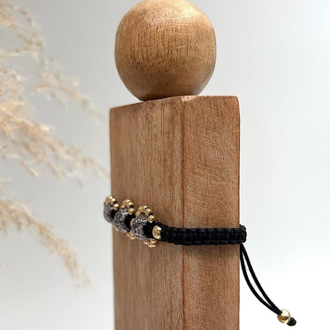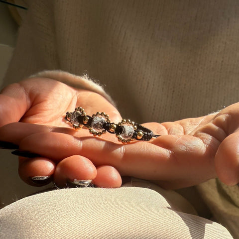 This macramé bracelet features three glass beads infused with memorial ash, each one holding a part of someone dearly missed. The hand-knotted cord adds a quiet layer of sentiment - a reminder that every detail was made with care. Silver or gold accents softly frame the stones in a design that feels delicate, feminine, and almost floral. A beautiful way to carry their memory with you, always.