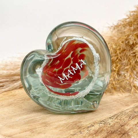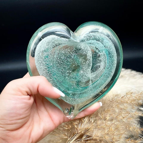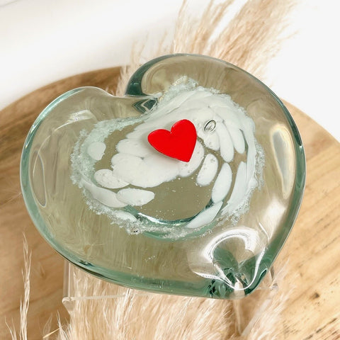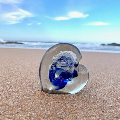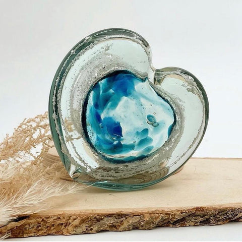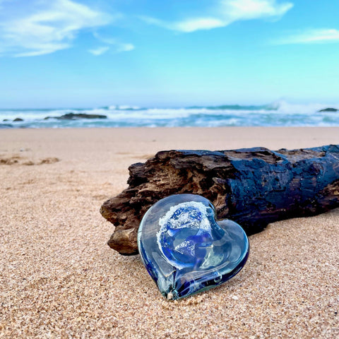 A hand-blown glass heart, gently infused with the ashes of a loved one — a tender, lasting way to hold their memory close. Each piece is lovingly crafted so the ashes are visible within the glass, creating a one-of-a-kind tribute as unique as the life it honours.