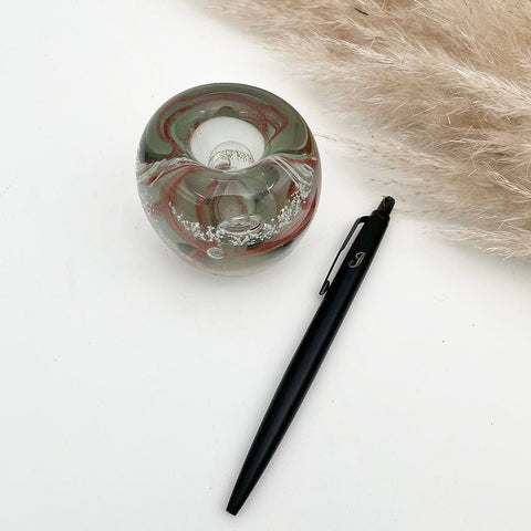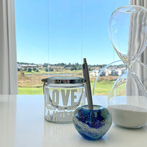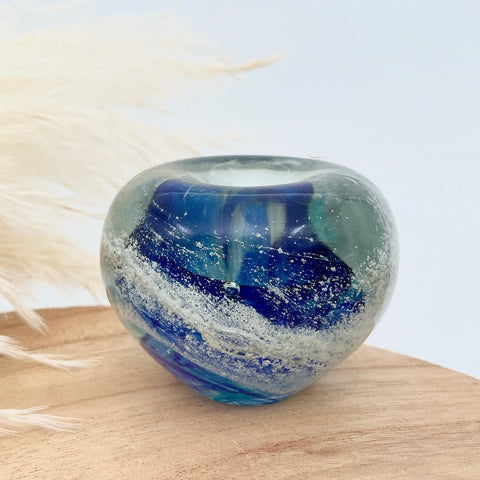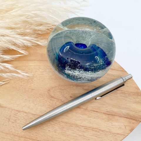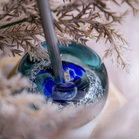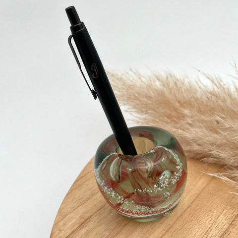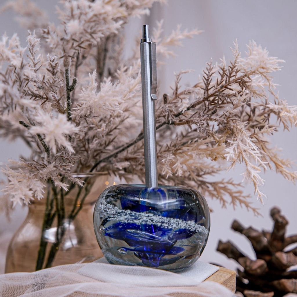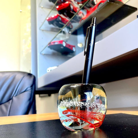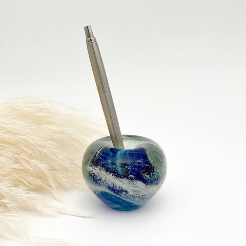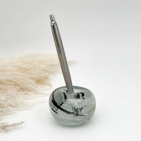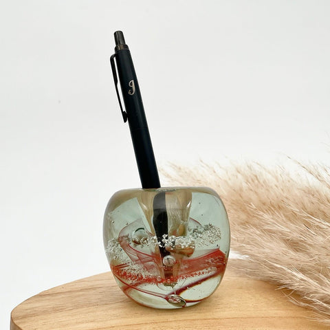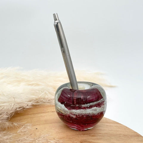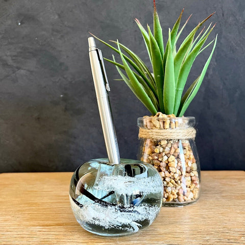 A hand-blown glass pen holder, gently infused with cremation ash — a meaningful way to keep the memory of a loved one close, even in everyday moments. The ashes are visible within the glass, creating a unique and personal tribute.