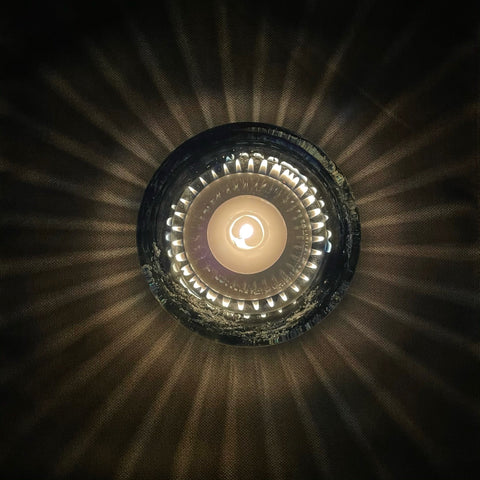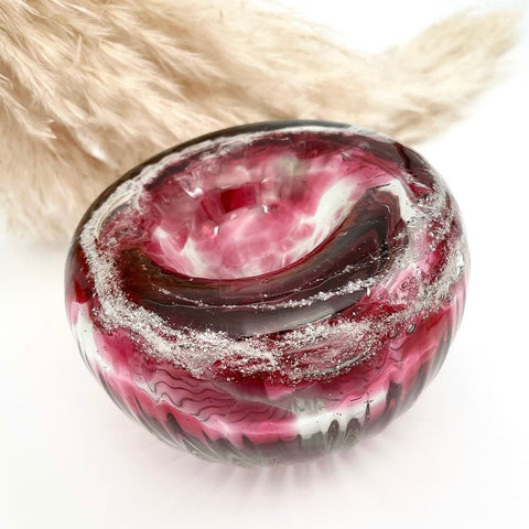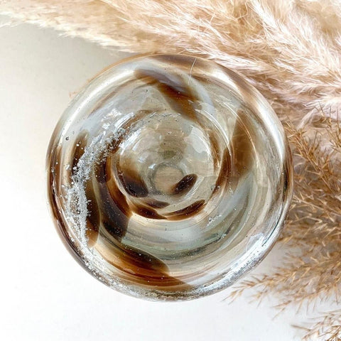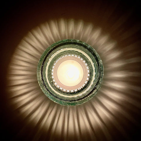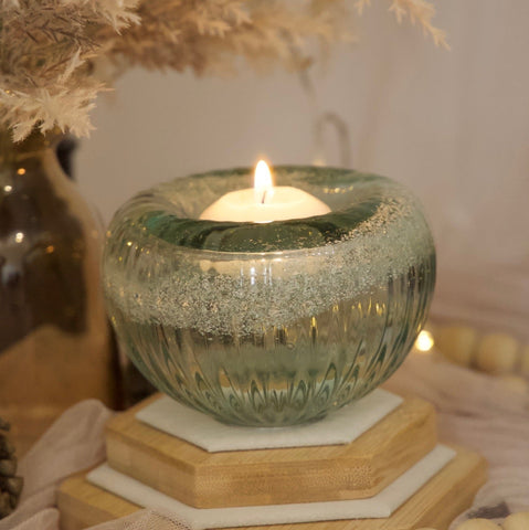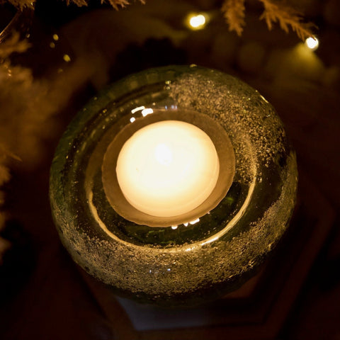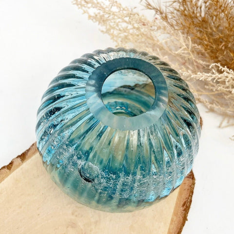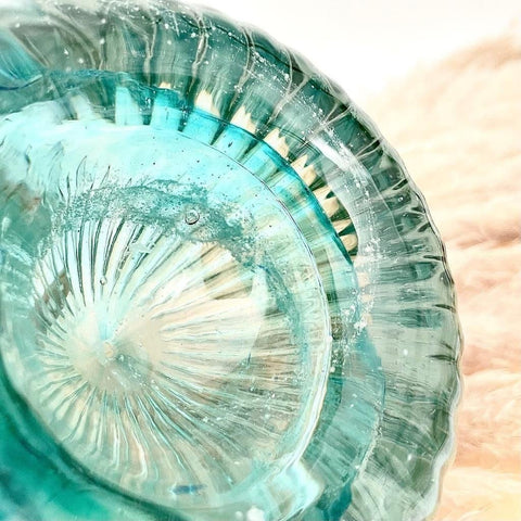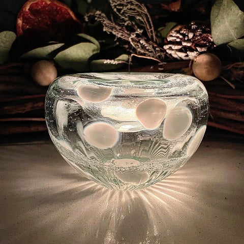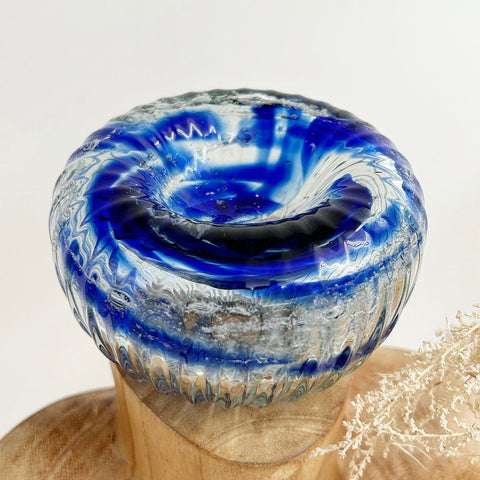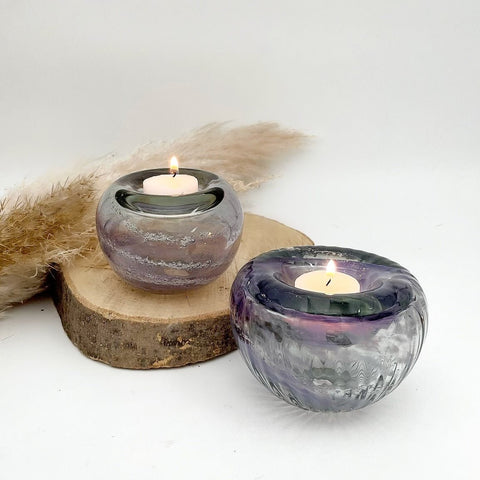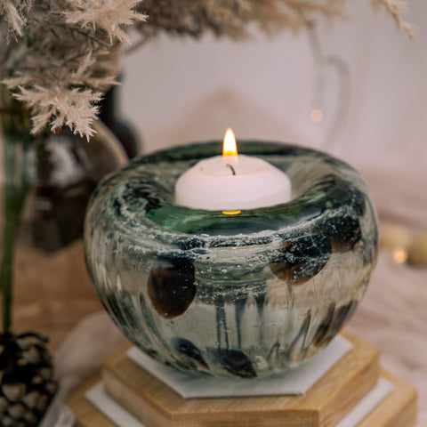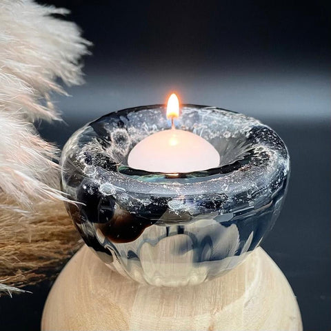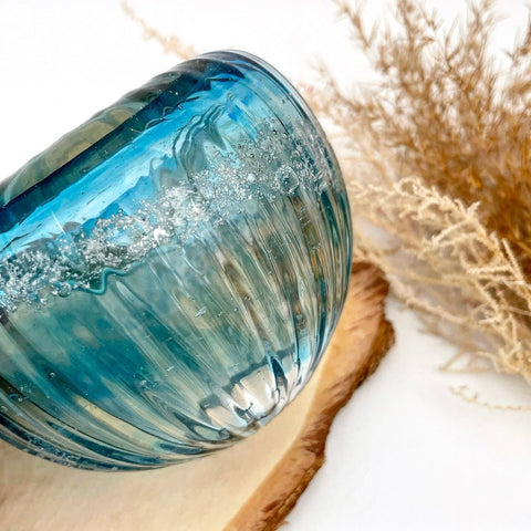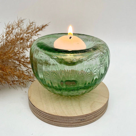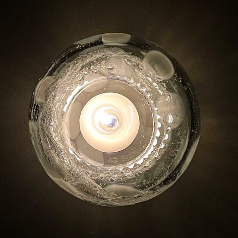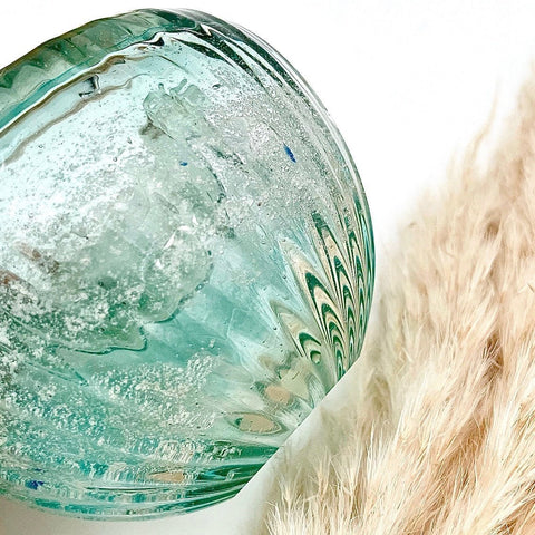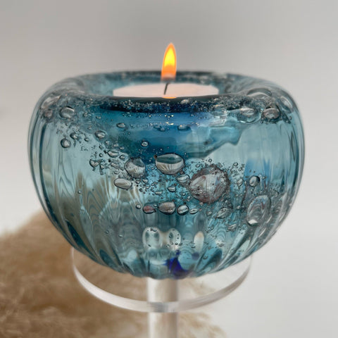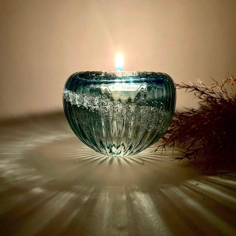A hand-blown glass candle holder with a delicate rippled underside, designed to cast a gentle, radiant glow when lit. Each piece is lovingly infused with cremation ash, creating a quiet, personal tribute that carries the memory of a loved one.